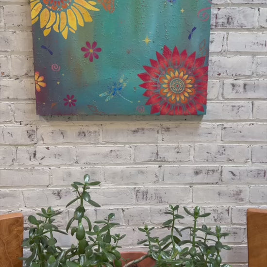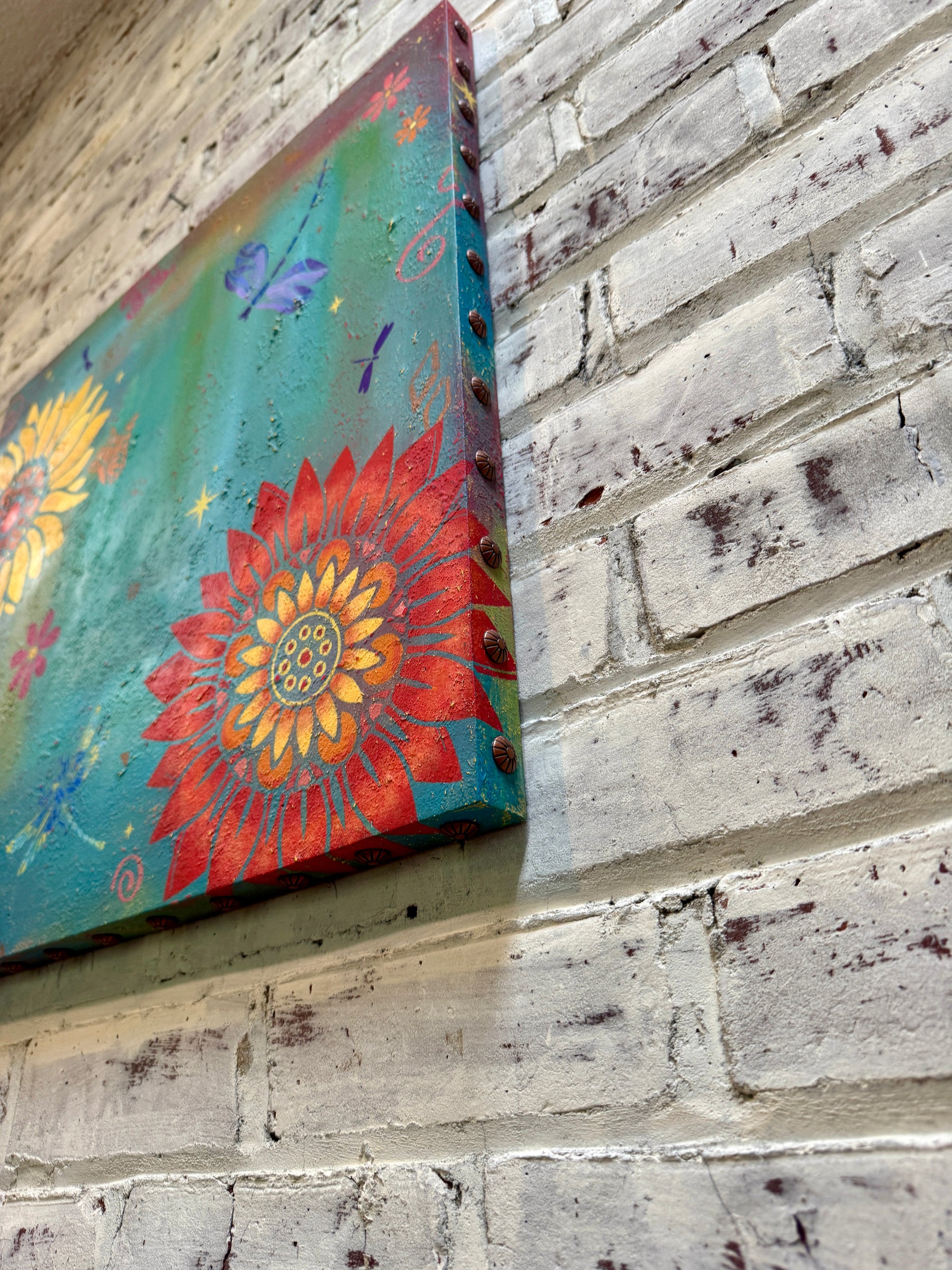 Transform your space with this stunning 24" x 24" handcrafted painting! Created on a custom wood box canvas, this vibrant artwork features bold sunflowers, delicate dragonflies, and a textured chalk paint finish that adds depth and character. Enhanced with upholstery bronze tacks on all four sides, this colorful piece embodies an eclectic bohemian style, perfect for art lovers seeking a unique, rustic-modern statement.