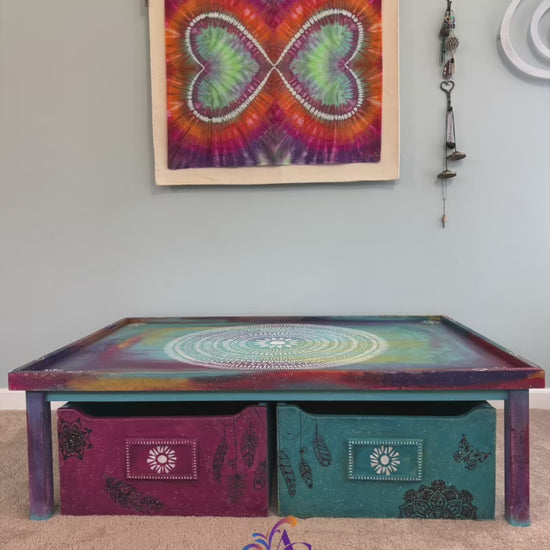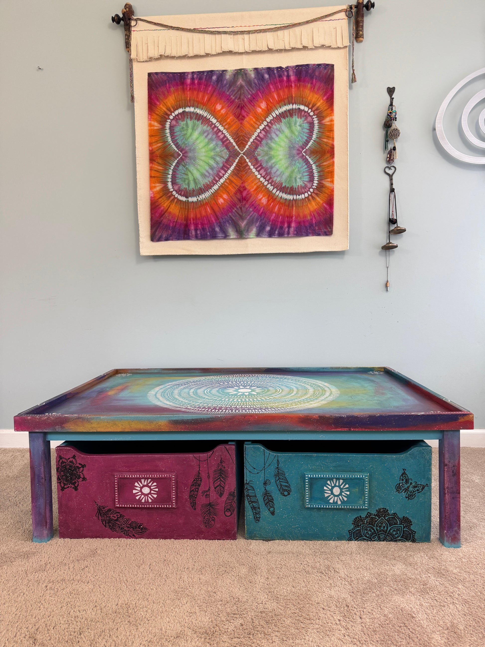 Unleash your boho spirit with this funky, hand-painted coffee table that’s bursting with color and charm! Every inch of this vibrant piece is a canvas of creativity, featuring two cleverly tucked-under storage bins—also hand-painted with whimsical flair. Perfect for stashing treasures while adding a playful, rustic vibe to your space, this one-of-a-kind table is a must-have for free-spirited décor lovers. This beauty’s ready to steal the show!