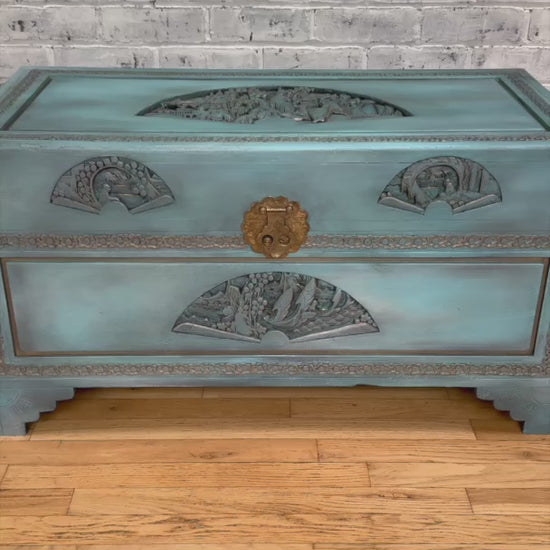 Discover the timeless charm of this upcycled antique Chinese camphor wood trunk! Expertly refurbished with a stunning hand-painted aqua blue finish, this unique chest blends traditional craftsmanship with modern flair. Featuring intricate carved designs and a secure brass lock, it offers both aesthetic appeal and functional storage. Perfect as a statement piece for your home or a thoughtful gift for collectors. Own a piece of history with this beautifully restored treasure!