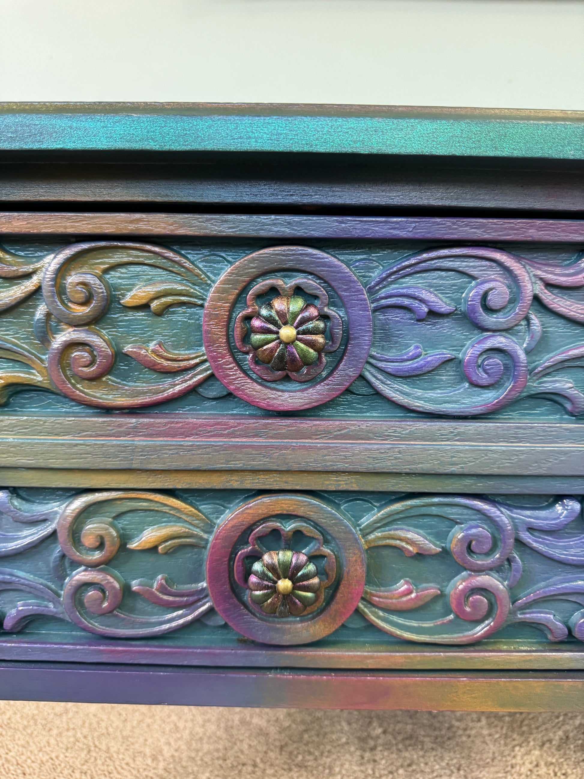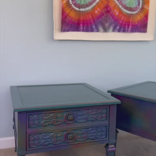 Transform your space with these stunning hand-painted, upcycled end tables, perfect as nightstands or accent pieces! Each table bursts with vibrant teal hues, artfully blended with colorful paint strokes and shimmering, color-shifting gilding wax accents. The crowning touch is the mesmerizing Flower of Life pattern on the tabletop.