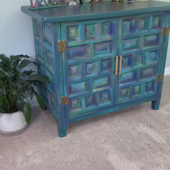 Introducing a one-of-a-kind, hand-painted 2-door cabinet that’s as vibrant as it is unique! This stunning piece, crafted from heavy, quality wood, boasts a rich teal finish with a kaleidoscope of colors peeking through intricate wood square detailing, creating a mesmerizing bohemian and oriental flair. Open the doors to reveal two spacious shelves, each adorned with decorative stenciling. This well-made, statement-making cabinet blends artistry and functionality, ready to elevate any space with its eclectic charm. Don’t miss your chance to own this exclusive masterpiece!